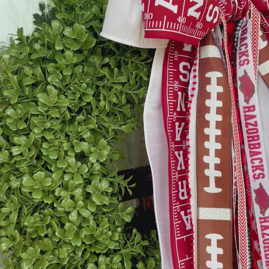 Show your Razorback Spirit this Football Season with the Arkansas Razorback Football Wreath. The boxwood base is topped with a BowBin filled with red and white ribbons, featuring Arkansas and football ribbons. This wreath is sure to make your tailgate pop!