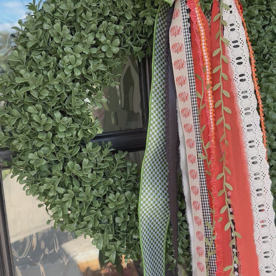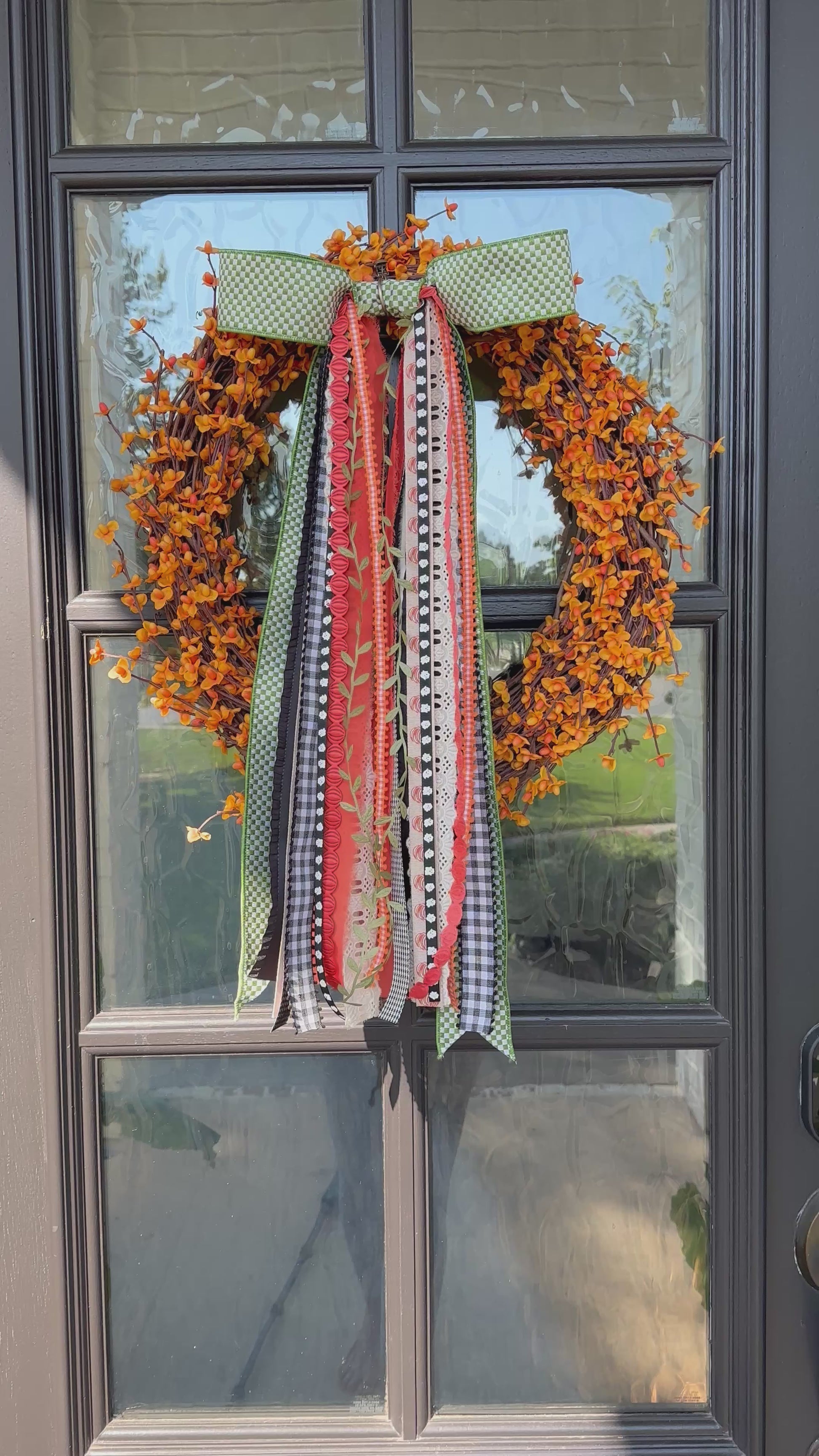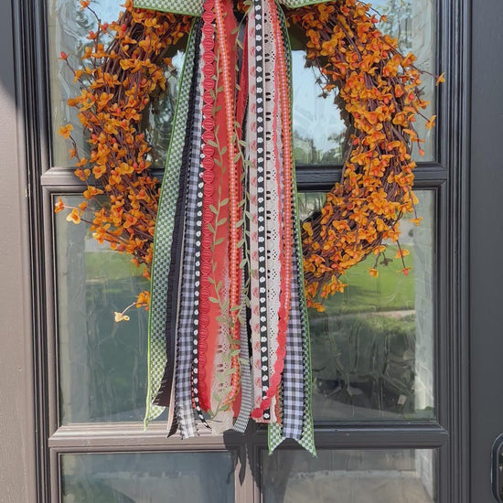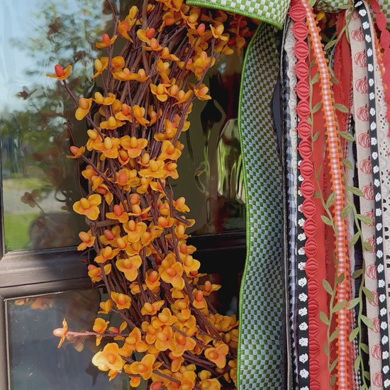 CHOOSE YOUR BASE: Orange Berry Wreath or Boxwood Wreath. This combo sets the stage for a layered BowBin, filled with green gingham, warm orange, and soft cream ribbons that capture the colors of autumn gatherings and falling leaves. This wreath is a simple yet striking way to welcome sweater weather and create an inviting seasonal touch for your home.