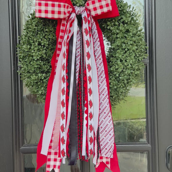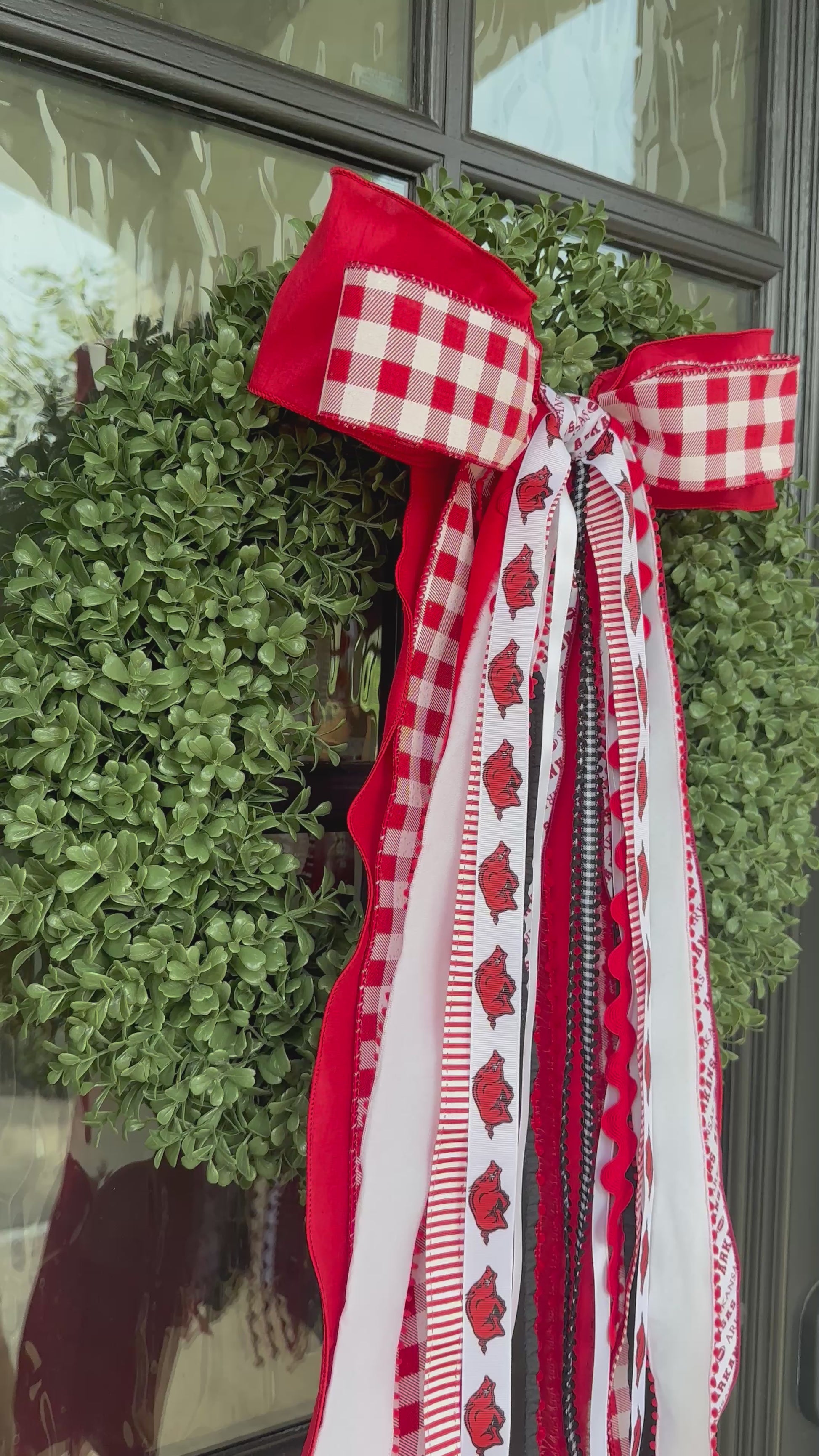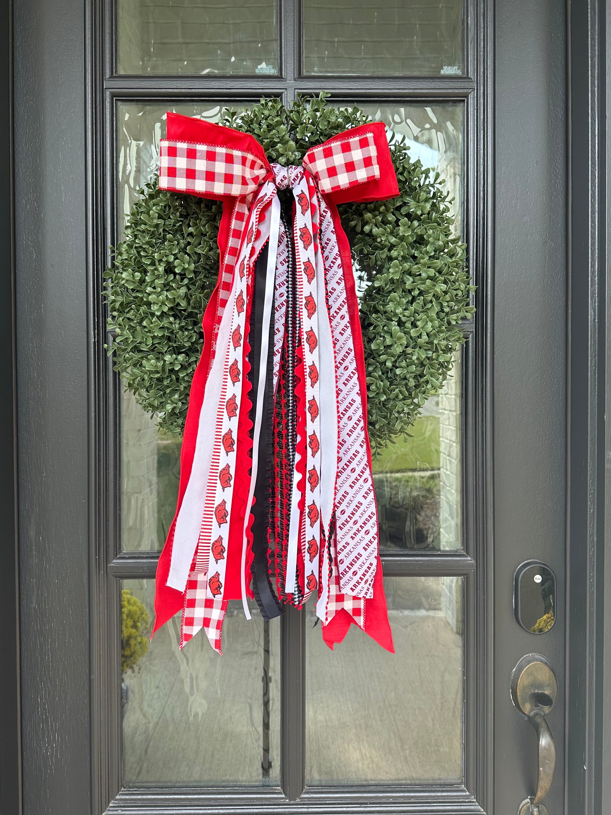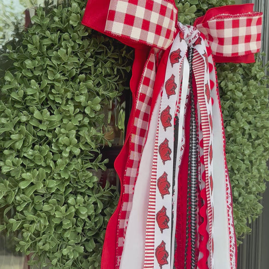 Bring your Razorback spirit front and center with the Hog Call Wreath, designed for fans who bleed red and white. This handcrafted wreath features a lush 24” boxwood base topped with a striking Hog Call BowBin, layered with bold red and white ribbons and finished with official Razorback-printed ribbon for the perfect game day touch.