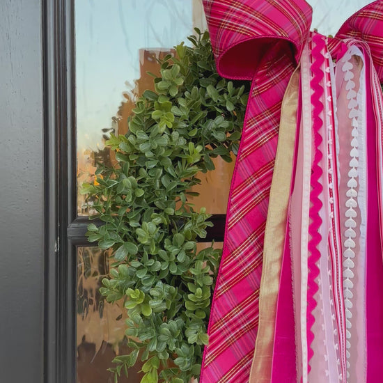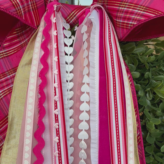 The Pink Plaid Valentine Wreath features a Stunning Pink Plaid Ribbon layered with coordinating pink, white, and gold accent ribbons.